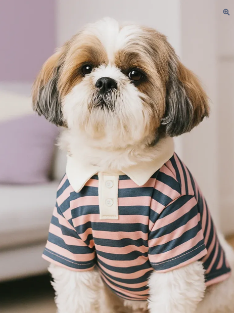 Suave, ligera y con mucho estilo, esta camiseta es perfecta para perrhijos con alma delicada y look coqueto. Su diseño de rayas gris oscuro y rosa pastel con cuello blanco le da ese toque dulce que roba suspiros.