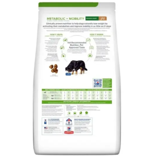 Hill’s Prescription Diet Alimento Seco Metabolic + Mobility j/d para Perro Adulto es una dieta clínica formulada por veterinarios para apoyar simultáneamente el control de peso y la salud articular en perros adultos. Su fórmula especializada ayuda a reducir el peso corporal de forma segura mientras mejora la movilidad y el bienestar general.
